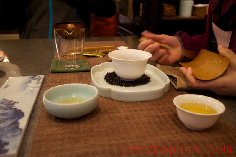 During my trip to China I was often invited home by friends and suppliers, so I had the chance to experience their everyday life and habits. In every house that I visited there was always a gong fu cha set on the table: electric kettle, cups, gaiwan or teapot, small pitcher, filter and bamboo tools. I was offered any type of tea, except maybe for the yellow one. Drinking tea at home is informal and relaxing, people don't pay so much attention to the steeping time and to the aesthetics, it's rather an excuse to get together and chat!