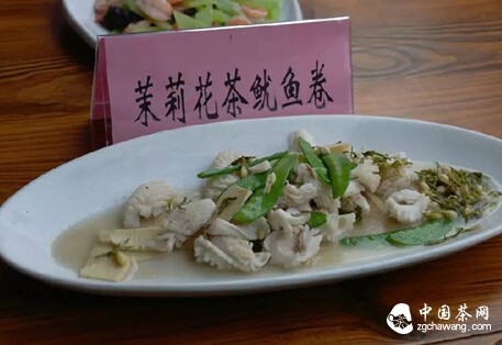 Squid Rolls with Jasmine Tea: Select 400 grams of high-quality squid, 7 grams of jasmine tea, 15 grams of cooking wine, 4.5 grams of salt, and an appropriate amount of starch, minced garlic, scallions, and ginger. Rehydrate the squid and score it into wheat ear patterns. Blanch in boiling water until curled, then drain. Brew the jasmine tea with boiling water, discard the first brew, and brew again to extract the tea fragrance. Remove the tea leaves, and mix the second brew with cooking wine, salt, and starch to make a sauce. Heat oil over high heat until 70-80% hot, quickly stir-fry the squid rolls, then drain. Sauté minced garlic, scallions, and ginger slices in the remaining oil until fragrant, remove the scallions and ginger, add the squid rolls, pour in the sauce, stir-fry quickly, sprinkle with a few jasmine flowers, and serve. This dish is visually appealing, smooth, tender, and fresh, with an elegant jasmine tea aroma.