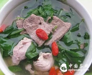 Iron Goddess Tea Sliced Pork Soup: Slice 50 grams of pork leg into thin pieces, mix with an appropriate amount of Shaoxing wine, salt, MSG, pepper, egg white, and dry starch, and marinate for half an hour. Brew 15 grams of Iron Goddess tea with boiling water, drain, and brew again with 100 ml of boiling water. Shred 10 grams of pickled mustard tuber. Blanch the pork slices in boiling water until cooked, then set aside. Finally, add seasonings, tea broth, and tea leaves to 100 ml of fresh broth, bring to a boil, add the shredded pickled mustard tuber, and then add the pork slices. This dish has tender meat and a fresh broth, being oily but not greasy.