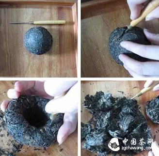 Below is a method to break up Tuo tea using a tea pick.