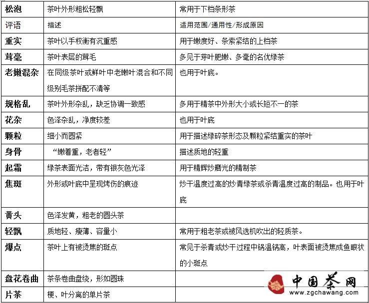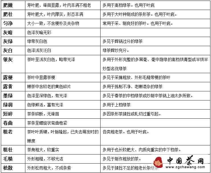1. Terminology for evaluating green tea leaves' appearance: