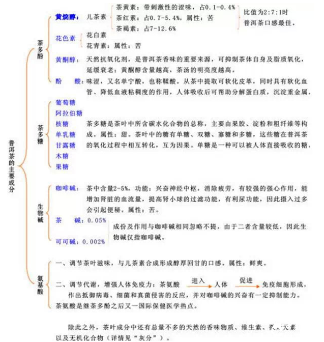Pu-erh tea has chemical components similar to those of general tea, with the difference being that Pu-erh tea, made from Yunnan large-leaf varieties, exhibits the characteristics of "three highs and one low." The "three highs and one low" refer to high contents of tea polyphenols, alkaloids, and water extracts, and a low content of amino acids.