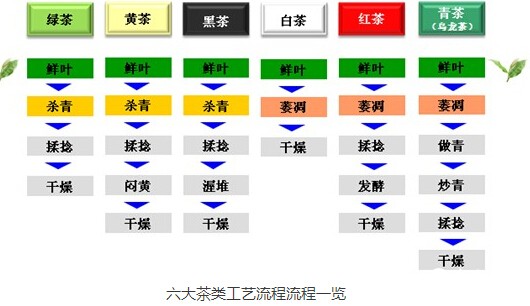 The basic production methods for the six major tea types are composed of selecting several steps from the six processes: killing the green, withering, rolling, "fermentation" (or doing green), piling/menhuang (wo dui and men huang), and drying. Three types start with killing the green, the other three start with withering, and the final step for all is drying. Different combinations of processes form different tea types. Although the processes are similar, different technical measures within a process lead to different product qualities. There exists a dialectical relationship between quantitative and qualitative changes.