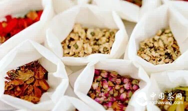2. Take a teacup, put in the herb bag, chrysanthemum, and green tea. Pour in 350ml of boiling water, let it cool, then drink.