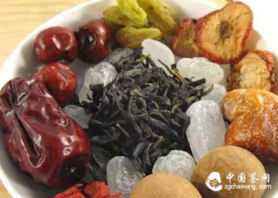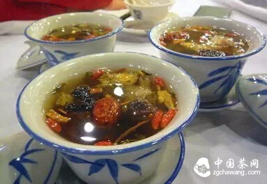 Eight-treasure tea, as the name suggests, contains eight ingredients, typically including tea leaves, red dates, wolfberries, walnut kernels, longan, sesame seeds, raisins, and chrysanthemums, though additional items can be added based on personal preference. The eight ingredients are placed in a lidded bowl, and boiling water is poured over them, causing the ingredients to swirl inside. The tea tastes sweet and delicious, with a unique flavor, and has effects such as nourishing yin, moistening the lungs, and soothing the throat.