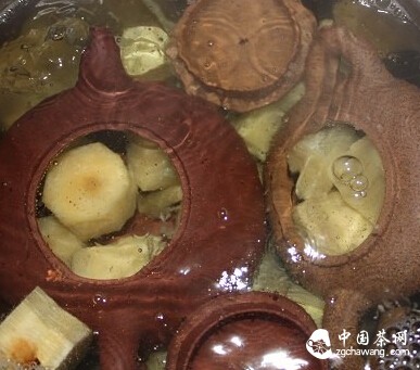 Boiling with tea leaves: Remove the teapot that has been boiled with sugarcane, let it cool naturally until no heat remains. Take your best tea leaves—if this teapot will be used for Pu'er tea in the future, use Pu'er; if for green tea or Tieguanyin, use Tieguanyin. Add cold water to the pot again, place the teapot and tea leaves together, and bring to a boil. After boiling, let the kitchen fill with aroma for 10 minutes or longer.