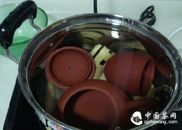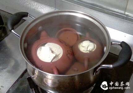 Separate the teapot body from the lid, place them in a pot. Boil until just before boiling point, then let sit for 5-10 minutes. Place tea leaves inside the teapot, heat over a low flame for a while, then let it cool naturally and dry. Pour out the water from the teapot.