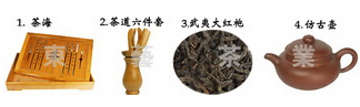 Tea brewing tools: one purple clay pot, Dahongpao (premium grade used here), one electric kettle, one set of basic Kung Fu tea utensils (including one tea pitcher, one bamboo tea ceremony set of six pieces, one purple clay pot, one ceramic tea storage can) as shown below: