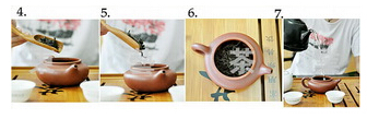 4-7. Rinse the tea: Use a tea spoon to place an appropriate amount of tea leaves into the purple clay pot. Rinsing should be quick, just enough to awaken the aroma of the tea leaves, without extracting the flavor.