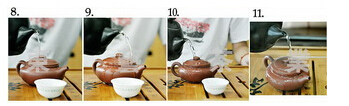 8-11. Brew the tea: Discard the rinsing water, pour boiling water into the pot, cover and brew for 4–5 minutes. During this time, pour boiling water over the pot three times to fully release the rich tea aroma under high heat.